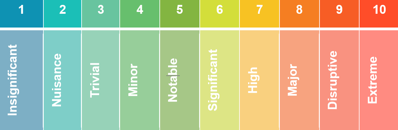 The values of the Impact Indicator are ranked on a scale of 1 to 10 where 1 means the weather event is insignificant and will not be disruptive to your business and 10 means the weather event could be extremely disruptive to your business. The graphic below shows you how you can interpret each of the values between 1 and 10 on the scale and how they may impact your business: